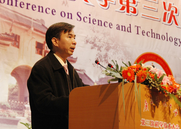 我校副校长易忠主持开幕会。校长梁宏代表校党委、行政作了题为《不断增强自主创新和服务社会能力,努力建设创新型地方综合性大学》的工作报告。报告全面回顾了2003年10月我校召开第二次科技大会以来学校科技工作所取得的主要成绩与经验。三年来,在全校科技工作者的共同努力下,我校科技工作取得了长足发展,拥有了一批在广西乃至国内同类院校中占居重要地位的学科,造就了一支学术水平较高、自主创新能力较强的科技队伍,构建了若干基础扎实和条件良好的科研平台,取得了一批在广西乃至国内有较大影响的科技成果。2003年至今,学校共承担科研项目650项,其中国家级科研项目54项,全校科研总经费达7629.32万元;出版学术著作382部,发表学术论文3498篇。三年来,我校荣获省部级以上科技专家称号7人次;荣获省部级以上科技人才称号18人次;获得8项广西科技进步奖,33项广西第八次社会科学优秀成果奖。与此同时,我校国家文科基地建设在终期评审中获得“优秀”等级;马克思主义理论与思想政治教育、古代文学、教育学等学科的优势得到加强。从2005年起自治区党委、政府依托我校启动了繁荣广西高校人文社会科学的“人文强桂”建设工程,有力地促进了我校人文社会科学的发展。