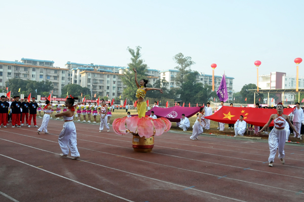 上午8时,开幕式举行,田径场围栏上悬挂着的“尊师重道,敬业乐群”的校训格外醒目,各学院各单位方块队依次列队入场。在入场式中,各单位代表队踏着整齐矫健的步伐,喊着响彻云霄的口号依次走过主席台。各单位方块表演队标新立异、精彩纷呈:美术学院坚持着“更高、更快、更强”的目标,以独特的艺术形式展现了他们的必胜信念;而秉承着“低碳”理念,生命科学学院院用灵动的环保时装、跳动的森林精灵、舞动的花海仙子,演绎着生命的美丽与活力;音乐学院用热情的歌声唱响校园,用激情的舞蹈舞动雁山,诠释自身进驻雁山校区后带给全校师生最丰富校园文化生活所做的努力;外国语学院用传统的日韩风情服饰表演以及热情奔放的西班牙风情舞蹈,点燃了整个会场的激情;“魔力化学,点亮生活”;化学化工学院用“魔术师”方阵向观众展示了一个充满活力与魅力的集体;历史文化与旅游学院则在辛亥革命100周年即将到来之际,集体诵读《少年中国说》,用行动传承历史的智慧,用汗水成就明天的辉煌;由来自世界30多个国家和地区的留学生打着“我爱广西师大”横幅的国际文化教育学院队伍,彰显了我校对外文化教育交流的丰硕成果……入场式表演在实验幼儿园小朋友精彩的舞蹈表演中落下帷幕。