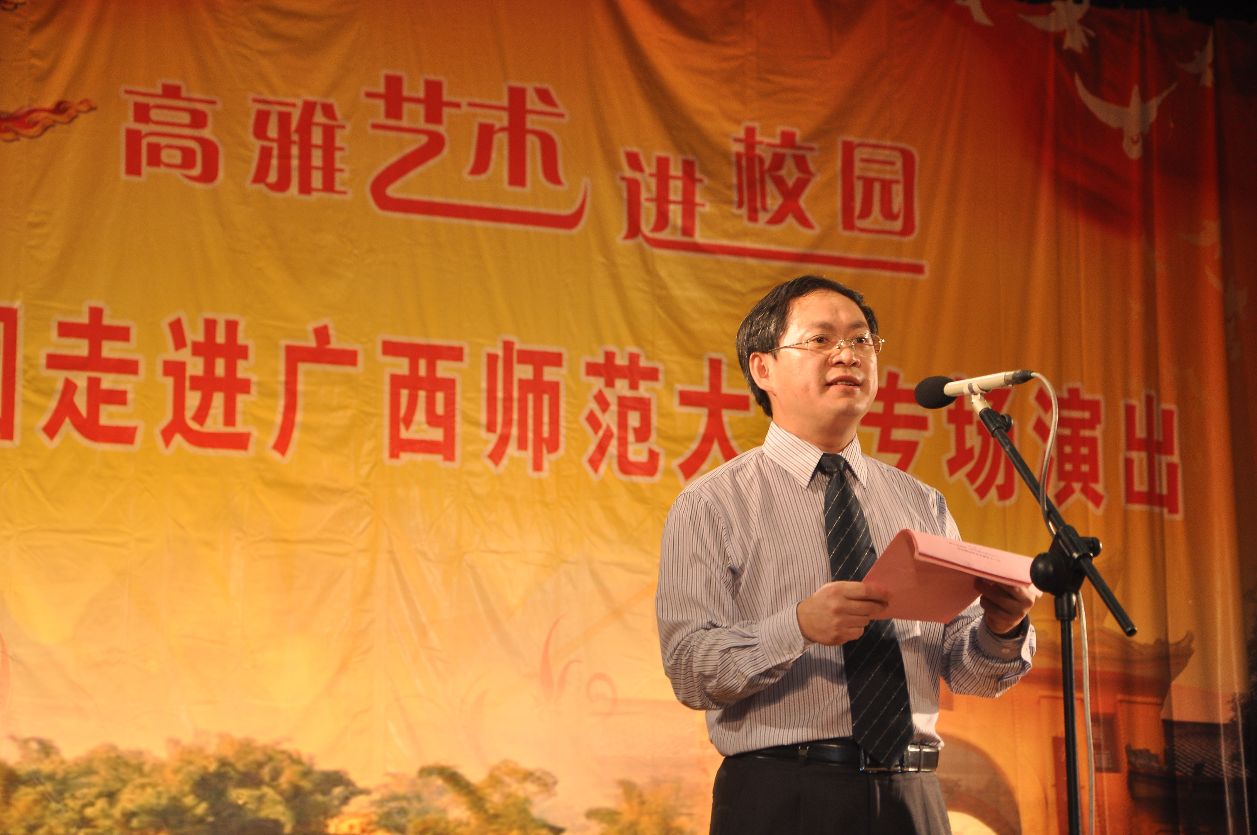 王枬书记介绍,我校艺术教育底蕴深厚,1932年建校以来,一大批艺术大师到校奠定了我校在艺术教育特别是戏剧方面的深厚基础。我校在高雅艺术推广方面做了很多工作,十余年来坚持每年举办“一院一节一特色”校园文化艺术节活动。连续三年获得全国高校大学生艺术展演的一等奖,并由此获得2011年艺术教育先进单位,去年我校还获教育部全国高校校园文化建设优秀成果一等奖,成为广西唯一获此殊荣高校。“希望高雅艺术进校园这一审美教育、艺术教育能永远开展下去,从而达到活动宗旨:走近大师,感受经典,陶冶情躁,提高修养。”她说。