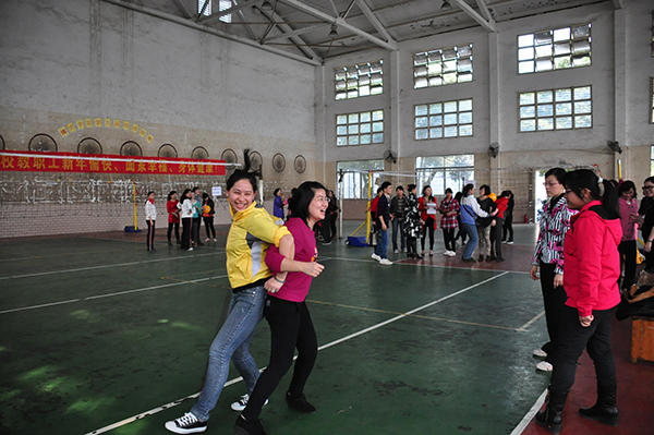 随后,乒乓球投准、羽毛球投准、背靠背夹球接力走、3分钟连续摇跳长绳等六个体育项目重装上阵,原本在三尺讲台上倾心授课的女教师们热情的投入到比赛中,任凭汗水的挥洒,尽情地为别人加油助威,一时间加油声、欢呼声、哨声、脚步声响彻育才校区球馆上空。