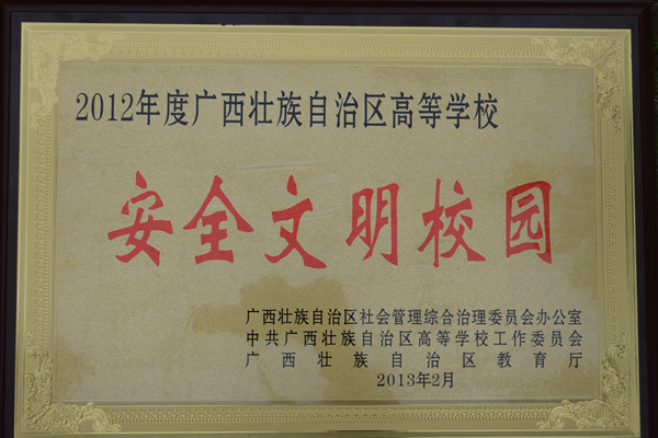 我校历来高度重视安全文明校园创建工作,认真对照《广西高等学校安全文明校园考核测评指标体系》和《广西高等学校安全文明校园申报考核测评办法》,努力推进制度建设、校园安全、校园稳定、校园环境、校园文化、文明创建等方面的建设工作,完善组织机构,落实工作责任,提高预防、控制和处置能力,全年没有发生影响安全、文明、稳定的事故,为学校的科学发展营造了良好的校园环境、舆论氛围、文明风尚和文化条件,有力地促进学校教学、科研等各项工作的蓬勃发展,得到了自治区综治委、区高校工委和教育厅的一致肯定。