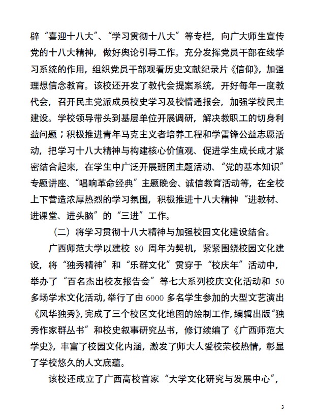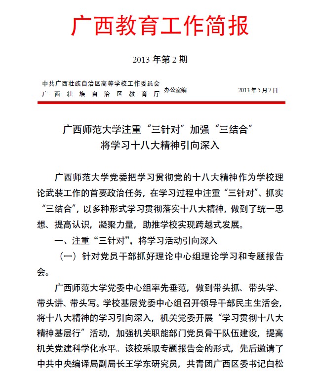 日前,在中共广西壮族自治区高等学校工作委员会、广西壮族自治区教育厅办公室编发的《广西教育工作简报》上,刊发了《广西师范大学注重“三针对”加强“三结合”将学习十八大精神引向深入》为题的经验介绍,向全校各高校推介我校学习十八大精神的经验做法。