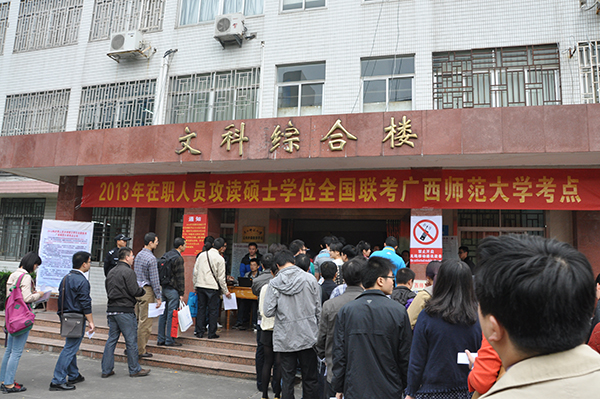 10月27日,2013年在职人员攻读硕士学位全国联考顺利结束。我校作为广西考区的三个考点之一,共设考场50个,考生共计1555人次。本次设置考场总数及考生累计参与人次数均达到历年该类考试之最。我校考点在职人员攻读硕士学位全国联考考场全部使用第二代身份证进场验证系统,有效地防止了替考现象,严肃了考纪考风。