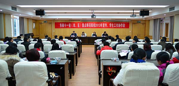 12月17日—18日,东南十一省(市、区)重点师范院校2013年宣传、学生工作协作会在我校召开,来自南京师范大学、湖南师范大学、华南师范大学、山东师范大学等13所东南十一省(市、区)重点师范院校的50位参会代表相聚桂林,就共同关注的青年教师思想教育、大学文化建设、网络思想政治教育、校园新媒体运用、学生工作体系创新等内容进行了深入地交流和研讨。