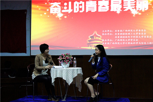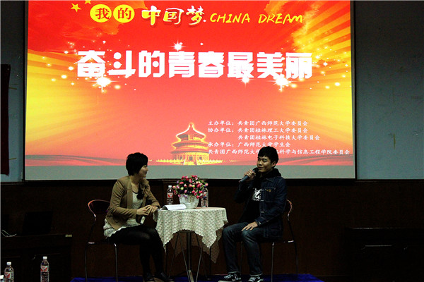 这次团日活动借鉴了“非诚勿扰”的节目形式,由韦笑老师以及刘仁路、肖宝莹、余宗财、孙明艳、陈莹五位同学担任梦想嘉宾。团日活动在轻松融洽的氛围中拉开帷幕,视频短片之后,海归美女博士韦笑老师向同学们分享了自己的青春如何找到目标,并不断为之奋斗,打下基础的故事;余宗财同学分享了自己作为马龙队的队长如何带领队员刻苦训练,勇于追梦,最终夺取世界啦啦操锦标赛冠军的的故事;刘仁路同学分享了他“创新创造未来,实干成就人生”的奋斗理念,作为广西师范大学拥有9项发明已得到国家专利的学子,目前已保送为北京大学硕博连读生。他说:“发明就源于生活,有时候多留意身边的小事,灵感就在身边”;肖宝莹同学分享了她的基层教师梦和志愿服务基层过程中因为感动而选择坚持的故事;桂林理工大学的孙明艳同学分享了她带领团队参加学术科技竞赛,最终获得全国“挑战杯”课外学术竞赛奖项的故事;桂林电子科技大学的陈莹同学分享了她的主播梦和创业成功、成立配音工作室的故事;在互动交流环节中,同学们发言踊跃,气氛热烈。在六位梦想嘉宾交流心得之后,主持人把现场分为六个小组,来自不同学校的同学们针对“毕业十年后的我”的话题展开了热烈的讨论,纷纷为自己毕业后的十年勾勒一幅幅美丽蓝图,现场气氛达到高潮。
