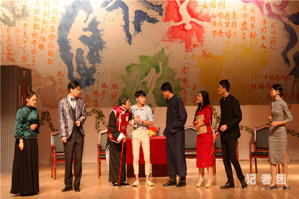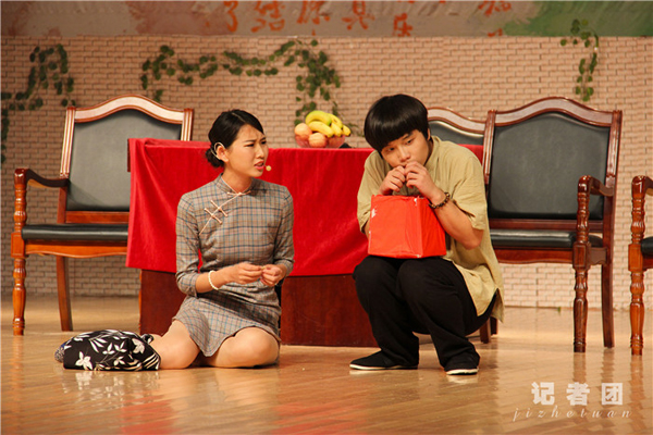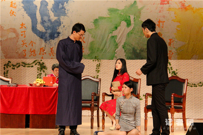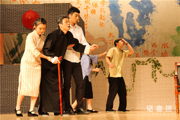 《旧家》演出分为三幕,当报告厅红色幕布在明亮的光线中缓缓拉开,演员们开始精彩的表演,博来在场观众一片积极热烈的掌声。他们运用生动活泼的表演,展现了在旧家矛盾重重的恩恩怨怨。如秦露丝“眼神戏份”的传神,形象地演绎出对表姐王宝裕内心的厌恶和贪图富贵的虚伪表现。老三“疯子”动作癫狂,大呼大叫“他是日本鬼子”,坐在秋千上抱着抓阄箱子吃纸。话剧迎来最后高潮,无可逆转的深沉矛盾,在旧家面临奔溃以及老四即将带领他们走向新生活中,画外音旁白出一幅幻想中美好家庭新“家”图景:“一家人做一样的事,说一样的话,家和万事兴。”