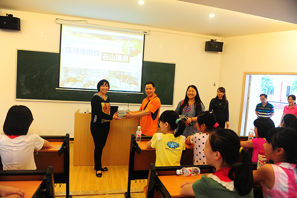 与此同时,四年级的孩子们也正在另外一个地点聆听一场特别的科普知识讲座:了解黑叶猴、白头叶猴、熊猴等栖息于喀斯特石山的濒危动物。这一讲座,由中国灵长类专家组成员、广西动物学会副理事长、生命科学学院教授周岐海先生主讲。四十分钟的讲座中,周教授用通俗易懂的语言将灵长类动物的特征、种类、分布、濒危状况等一一向孩子们做了介绍,并通过问答的形式为孩子们解读了“石山精灵”的奥秘