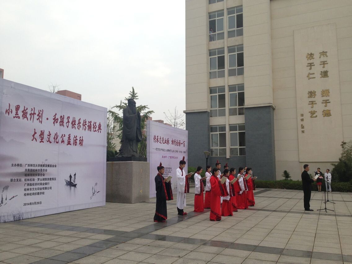 整个活动时长40分钟。王枬书记首先代表主办单位致辞,并为爱心捐赠企业和联合发起单位颁发荣誉证书。随后,全体人员向孔子雕像行拜夫子礼、文学院国学班同学进行吟诵表演。最后,全体人员在我校校友、桂林电台资深主持人山谷老师的带领下,齐声朗诵了《论语‧学而第一》。高大的孔子雕像、鲜美古朴的国服装饰、悠悠的古琴伴奏、空远悠长的吟唱旋律、铿锵有力的诵读声……让整个活动充满了朴实、庄重气氛。在孔子的诞辰日举行如此郑重的纪念仪式,表达对以孔子为符号载体的中华传统文化与国学的敬慕尊崇,也成为大学新生们入学难忘的第一课。“国学经典是滋养我们的根,我们只有扎好根,才能成材。”来自文学院的韦同学参加完活动之后,表达了自己的感受。活动还得到广西、云南两省(自治区)、桂林河池邵通三市,近30所大中小学响应,上万名师生参与了《论语》传诵。共青团桂林市委员会书记陈文彬、桂林市妇女联合会副主席关永兵分别出席了临桂县南边山乡玉联小学和我校附属小学(卓然小学)分会场的活动。