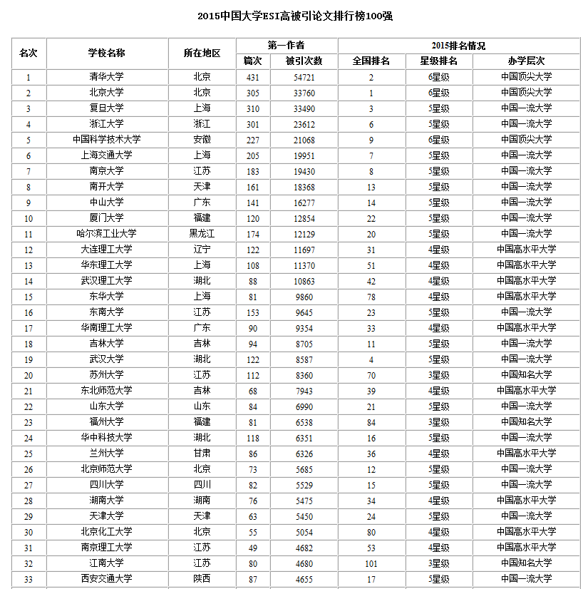 2015中国大学ESI高被引论文排行榜100强 http://www.cuaa.net/cur/2015/26