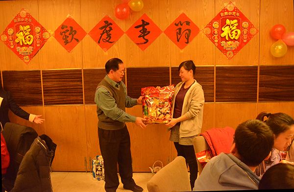 “这是我第一次在外过年,虽然不能和家人团聚,但我充分感受到了来自大家庭的温暖,有老师、同学的陪伴,我一点也不孤单;最后他代表留校同学祝所有的老师和同学们春节愉快。”因为忙于毕业论文,需要进行田野调查,没能回家过年的甘肃定西的文学院2012级研究生民俗学专业谢耀龙从学校领导手中接过慰问金和新年礼包,激动地说。