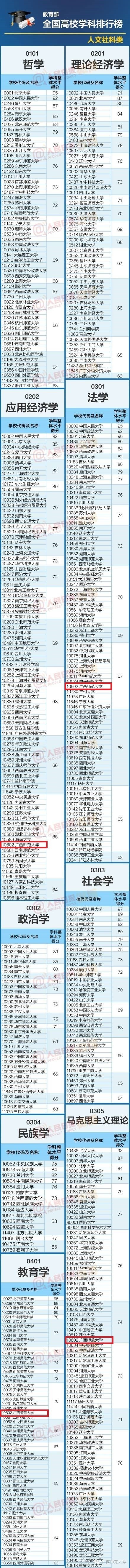 目前,我校学科门类齐全,是广西具有博士授予权的6所高校之一,拥有3个博士后科研流动站、2个博士学位授权一级学科、12个博士学位授权二级学科、22个硕士学位授权一级学科、152个硕士学位授权二级学科、15个专业硕士学位授权点和72个全日制普通本科专业,。有35个广西(高校)重点学科,学科专业涵盖哲学、经济学、法学、教育学、文学、历史学、理学、工学、农学、医学、管理学、艺术学等12大门类,形成了学科门类较为齐全、师范与非师范性专业协调发展、教育层次完备的人才培养体系。
