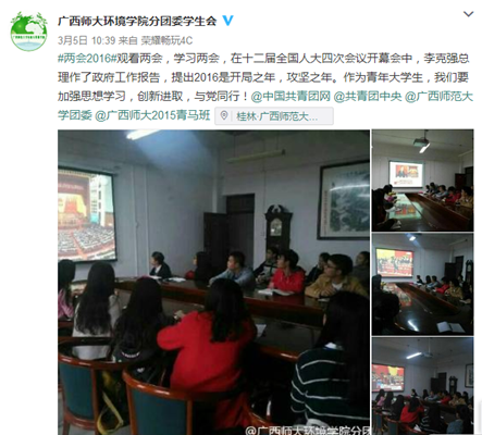 我校各学院分团委学生会也在微博公众号上积极转发关于“两会”的知识和最新动态,为广大同学们了解时政、关注热点,做到了及时阅读、及时宣传、及时通知。我校生命科学学院的学子们更是主动发起了微博话题#生科青马看两会#。生科院的同学们早早起床观看李克强总理作政府工作报告的视频直播,并拍下照片,发表实时评论。生科院学子@甘茗不是昵称发表此话题微博表示道:今天是周恩来总理诞辰,也是学习雷锋纪念日,更是两会召开的日子。在这个特殊的日子,作为一名当代大学生,更应该响应组织的号召,自觉学习两会精神,并做到学习与实践相结合。@广西师大环境学院分团委学生会发表话题微博#两会2016#道:2016是“十三五”开局之年,攻坚之年。作为青年大学生,我们要加强思想学习,创新进取,与党同行!
