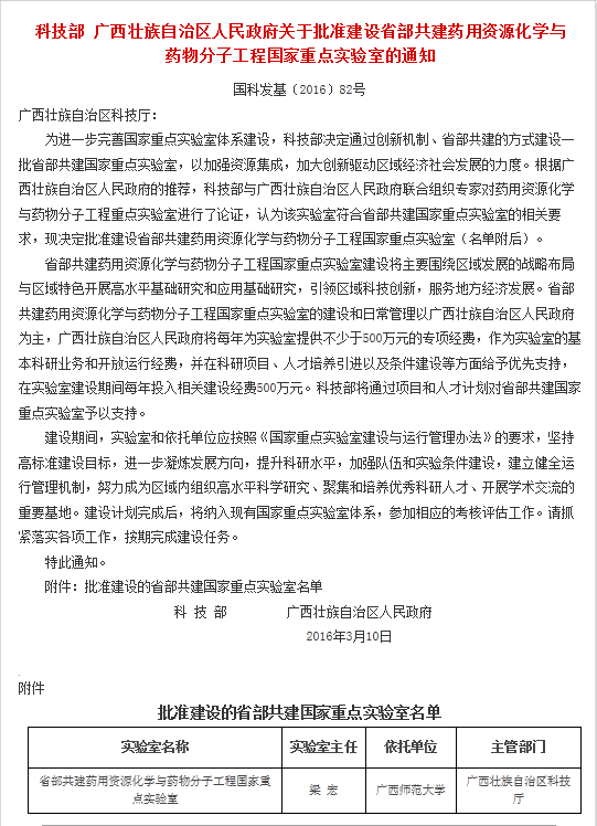 根据科技部、广西壮族自治区人民政府近日联合发布的国科发基〔2016〕82号文,我校“药用资源化学与药物分子工程重点实验室”被批准成为省部共建国家重点实验室,这是我校国家级科研平台的重大突破,也是广西第一家省部共建国家重点实验室。