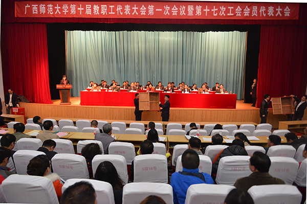 大会共分为五个流程,首先是表决通过《广西师范大学第十届教职工代表大会第一次会议暨第十七次工会会员代表大会选举办法(草案)》,宣读后全体鼓掌通过了《选举办法(草案)》。在表决通过大会选举的总监票人、监票人名单后,投票选举了第十届教代会执委会委员、第十七届工会委员会委员及第十七届工会委员会主席、副主席;表决通过第十届教职工代表大会提案工作委员会、民主管理与咨议工作委员会、生活福利工作委员会、教职工素质建设工作委员会、劳动权益争议调解工作委员会等5个专门委员会;表决通过第十七届工会委员会经费审查委员会、女教职工委员会等2个专门委员会。