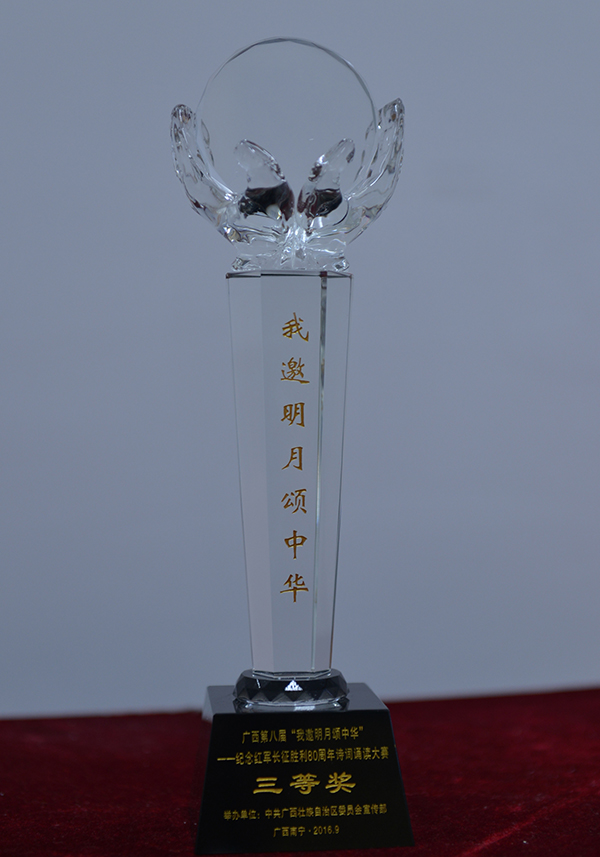 由自治区党委宣传部主办,广西电视台承办的广西第八届“我邀明月颂中华”——纪念红军长征胜利80周年诗词诵读大赛9月2日在广西电视台演播厅落下帷幕。我校代表队代表自治区高校工委参加全区纪念红军长征胜利80周年诗词诵读大赛荣获三等奖和优秀组织奖。经过前期的初赛、复赛,8月22日举行的全区高校纪念红军长征胜利80周年诗词诵读大赛总决赛中我校代表队作品《丰碑》荣获一等奖,最高分;最后我校代表队作品《丰碑》代表自治区高校工委参加全区纪念红军长征胜利80周年诗词诵读大赛。