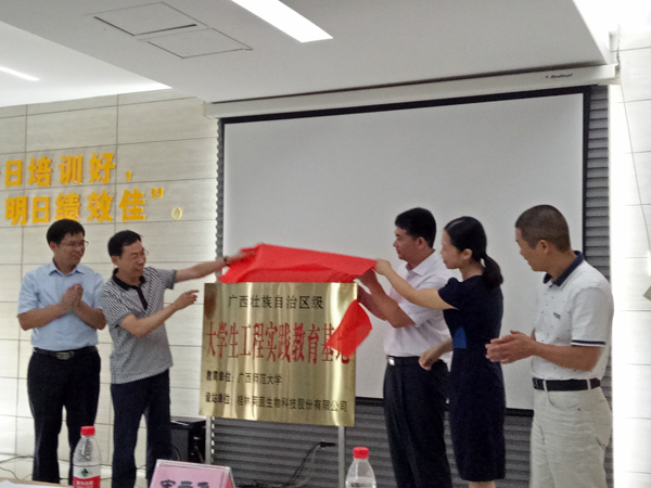 最后,化学与药学学院负责人、桂林莱茵生物科技股份有限公司总工程师宋云飞、董事长助理季永贤共同为共建的“自治区级大学生工程实践教育基地”揭牌。据悉,我校与桂林莱茵生物科技股份有限公司共建的大学生工程实践教育基地入选2016年度广西高等教育“创优计划”项目,是广西教育厅批准建设的31个自治区级大学生校外实践基地之一。化学与药学学院注重校企之间的合作与交流,该“自治区级大学生工程实践教育基地”的建立,将为相关专业本科生、研究生的实践教学、科学研究提供了良好的工程实践环境。经过会商,双方单位均表示一定要通过校企双方的密切合作与共同努力,把基地建设成组织机构健全、管理制度规范、拥有一批高水平的“双师型”指导教师队伍、工程实践硬件条件在行业内领先、实践教学体系完善,在自治区内能起到良好示范和辐射作用的工程实践教育基地。
