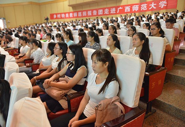 “特岗计划”是中国教育梦的基石,是加强乡村教育的新力量,也为推动农村教育的发展作出新贡献,深化了我们对乡村教育的认识。赵铁主持报告会总结时表示,在第32个教师节来临之际,教育部组织“播种未来与希望——乡村特岗教师巡回报告会”来展现新时期的乡村之美、教师之美。为了引导同学们树立教师情怀,选拔更多高校优秀毕业生走进乡村,并推动“乡村特岗教师计划”的贯彻落实,报告团莅临桂林,给高校师生作专场报告,体现了教育部对广西教育发展的高度重视,对于我们进一步做人才培养方案具有教育意义。希望通过这次报告会,能够进一步尊重有理想信念、有道德情操、有扎实学识、有仁爱之心的“四有”抱负教师,为推动我国教育事业科学快速的发展,为实现中华民族伟大复兴的中国梦作出更大贡献。