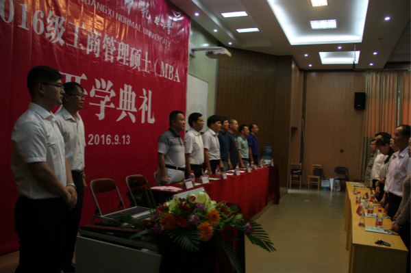 在庄严的国歌声中,开学典礼正式拉开帷幕。李传起副校长代表学校向正式加入我校这个大家庭的2016级新同学表示衷心的祝贺和诚挚的欢迎。他简要介绍了我校的创校历史、发展历程以及所取得的重要成就,充分肯定了经管学院及MBA中心不断创新的培养模式和管理机制以及取得的一系列成果。对肩负工作和学习双重重任的新同学,李副校长提出了殷切的期望: 一是审时度势,创事干业,做一个有创新精神的实干者; 二是不忘初心,奋勇前行,努力做一名勤勉、睿智、专业的MBA学员; 三是珍惜缘份,把握机遇,充分利用各种资源,互帮互助,携手共进,共同构建分享信息、交流经验和收获友情的平台。