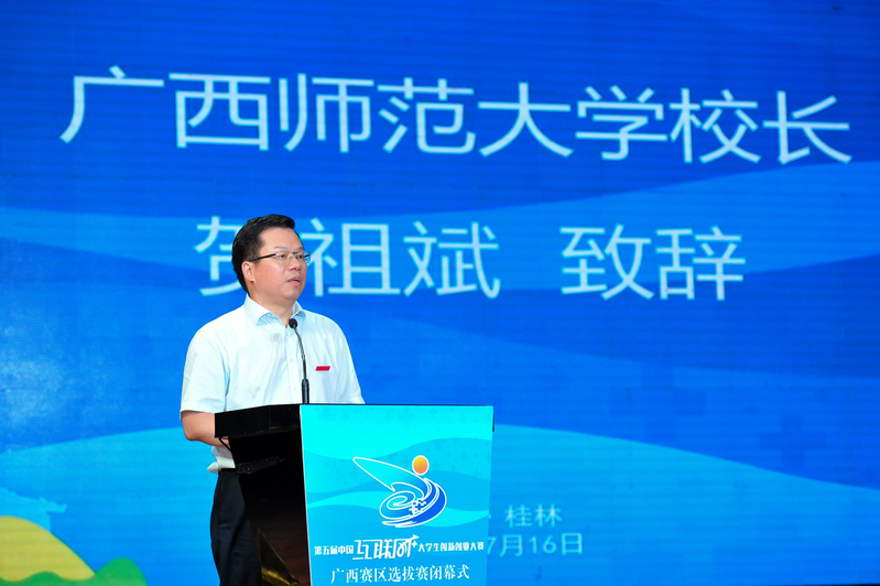 贺祖斌在闭幕式上致辞。贺祖斌表示,中国“互联网+”大学生创新创业大赛作为贯彻落实党中央创新驱动发展战略的重要举措,是各高校落实立德树人根本任务,深化产教融合、校企合作,加快学校综合改革和“双一流”建设,实现高等教育内涵式发展的重要抓手。本届区赛的很多项目结合创新驱动发展、精准扶贫等国家战略选题,体现了新时代莘莘学子的责任担当。评委、嘉宾充分肯定入围现场总决赛项目的质量,认为经过打磨,未来国赛“金奖”可期。
