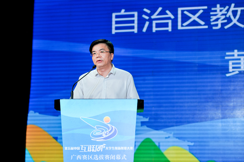 黄雄彪在闭幕式上讲话。黄雄彪在讲话中回顾了本届区赛取得的各项成果。他表示,第五届中国“互联网+”大学生创新创业大赛广西赛区的比赛即将结束,但是深化创新创业教育改革的任务还任重道远。黄雄彪希望大家强化担当,更加深入推动创新创业教育改革;希望大家解放思想,不断开创创新创业教育改革新局面;希望大家齐心协力,办好“互联网+”大学生创新创业大赛;希望同学们志存高远,让青春与创新同行,用奋斗成就梦想。