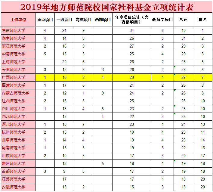据统计,就已经公布立项结果的国家社科基金年度项目以及教育学项目立项情况来看,我校以27项之多在地方师范院校排列第七名,在广西位列榜首。