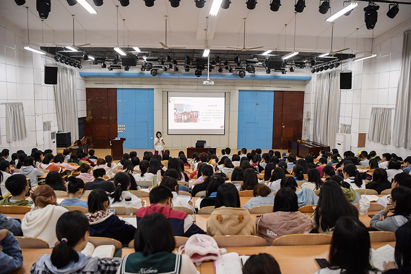 在雁山校区文二区119教室里,广西柳州市文惠小学教育集团总校长陈意曼老师“让世界因我的努力变得更美好”为题,从成为独特而幸福的自己、做一名“四有”好老师、让世界因我的努力变得更美好三个方面为主要内容展开报告。陈意曼老师分享了自己因家庭贫困而未能如愿上大学,却依然靠自己的努力在教师职业上奋斗31年的求学经历,以鼓励患癌学生重新面对生活为例,回忆了自己和学生成为良师益友的教学经历,以及如何带领当时只有五亩地的文惠小学走向未来的办学经历,激励同学们即使在艰难的环境中也要“心中有诗意,眼中有远方”,“努力让自己成为一个好老师”。报告会上,陈意曼老师全程站着为同学们演讲,同学们则安静地侧耳倾听,时而低头记笔记,当老师讲到动情处时,会场上不由地响起阵阵热烈的掌声。在提问环节,同学们踊跃举手提问,围绕坚持教师职业的初心的感想以及如何看待社会上出现的危害教师权益的行为、教师未来发展机遇等热点问题展开了交流。陈意曼老师耐心解答并强调,教师一定要以身作则,成为学生的榜样;少年有光明,国家就会有光明。