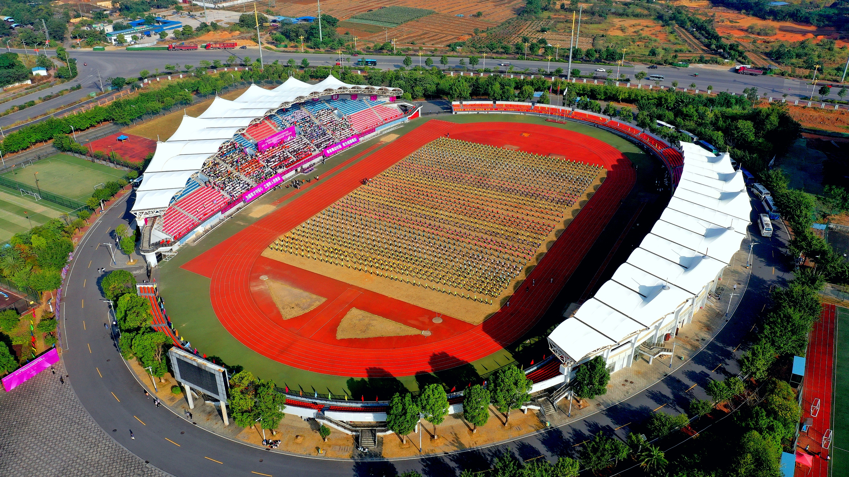 10月19日上午,为贯彻落实习近平新时代中国特色社会主义思想和党的十九大精神,全面贯彻全国教育大会和《国务院办公厅关于印发体育强国建设纲要的通知》精神,进一步引导我校学生积极参加体育运动,提高身体素质,营造健康向上的校园氛围,我校2019年体育文化节开幕式暨第一届“青春舞动校园·我为祖国喝彩”青春舞大赛在雁山校区体育场隆重举行。校领导、校党委常委;校体委、党办、校办、宣传部、学工部(处)、校团委、教务处、校友办等部门主要负责人;校友代表;各学院(部)党委书记、分管学生工作党委副书记、团委书记和副书记;各学院(部)参赛队员及学生观众参加了开幕式。开幕式由副校长黄文韬主持。