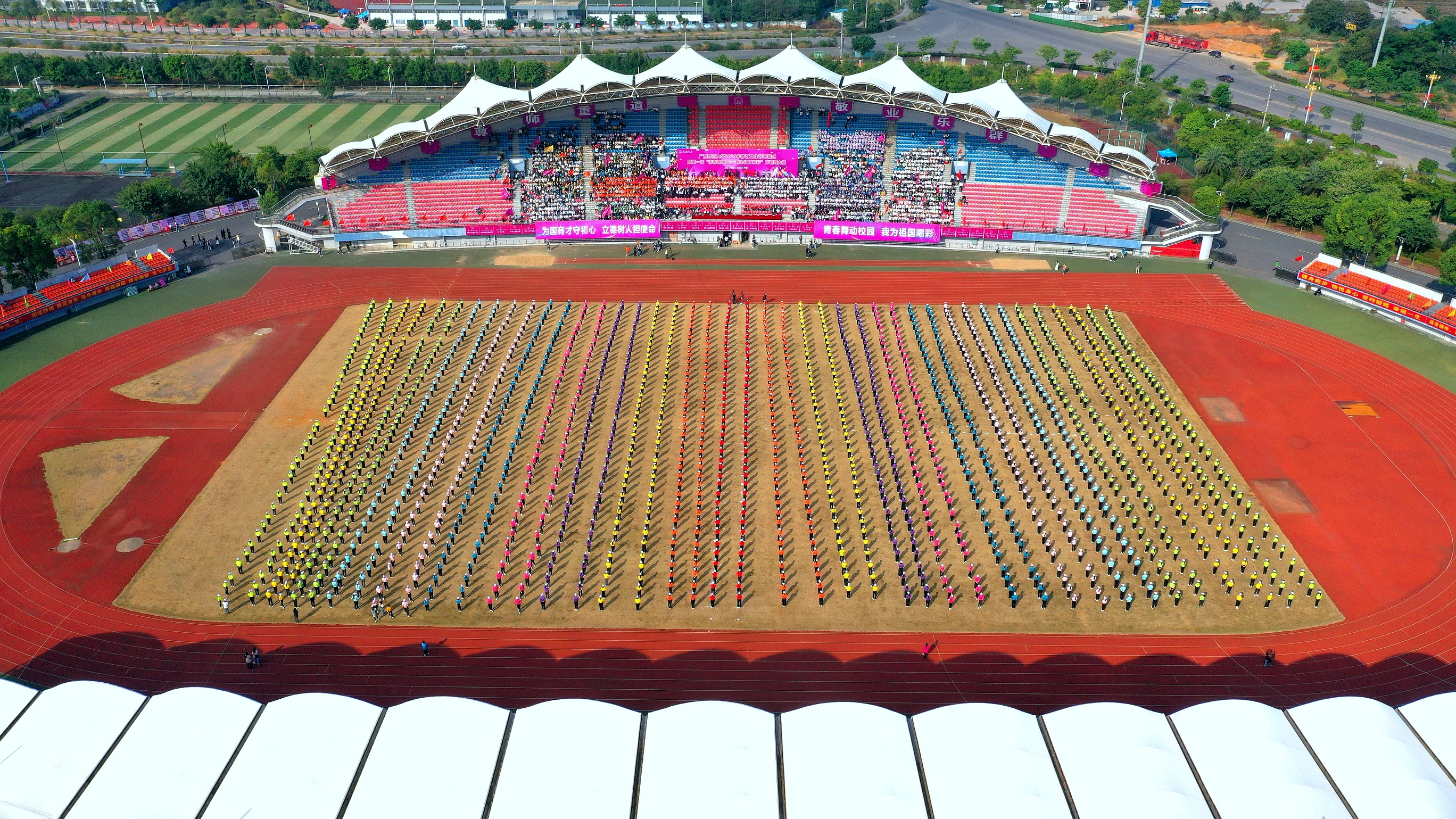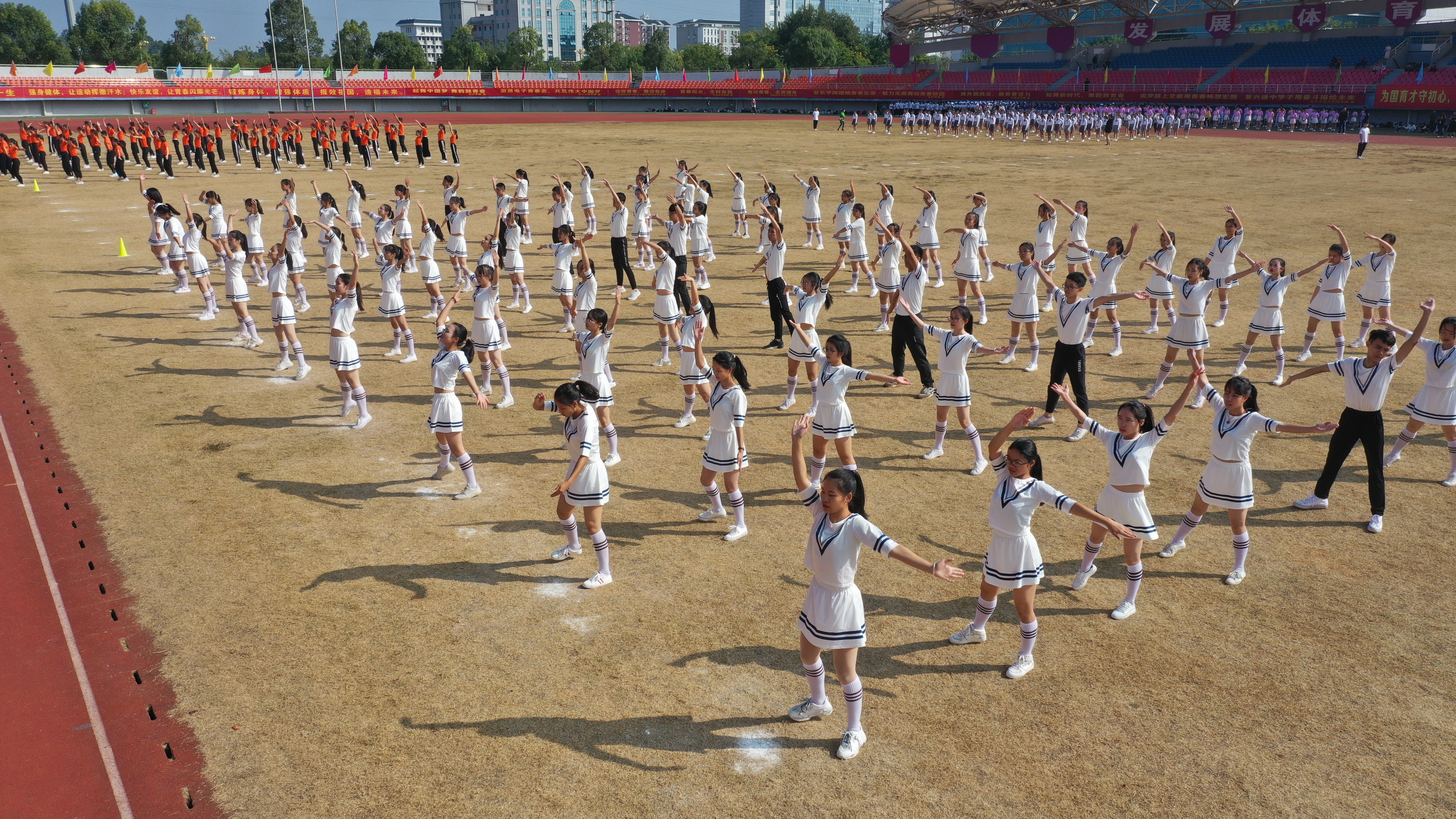 随后,近两千名学生进行了《青春畅想》青春舞集体展示。