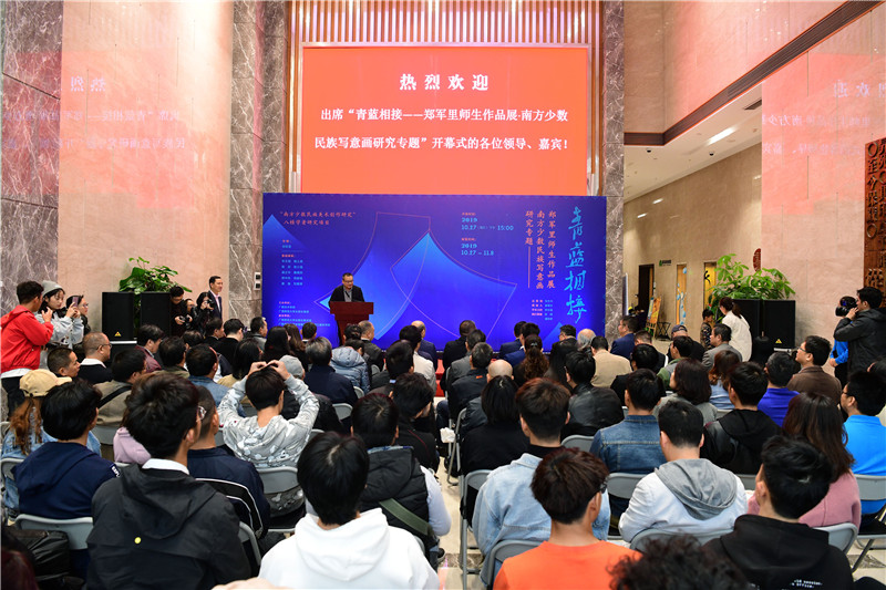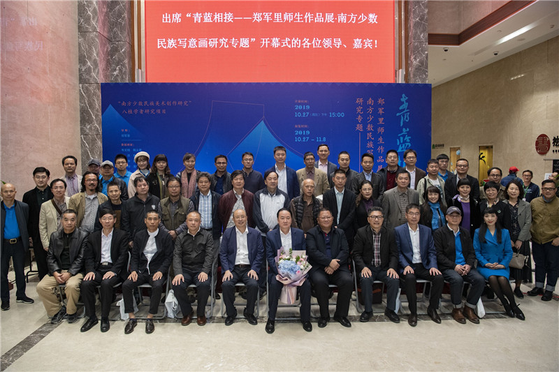 10月27日下午,由广西艺术学院、出版社集团主办,出版社集团美术馆、广西艺术学院中国画学院/漓江画派学院承办,广西师范大学美术学院协办的“青蓝相接——郑军里师生作品展·南方少数民族写意画研究专题”在广西师范大学出版社美术馆隆重开幕。