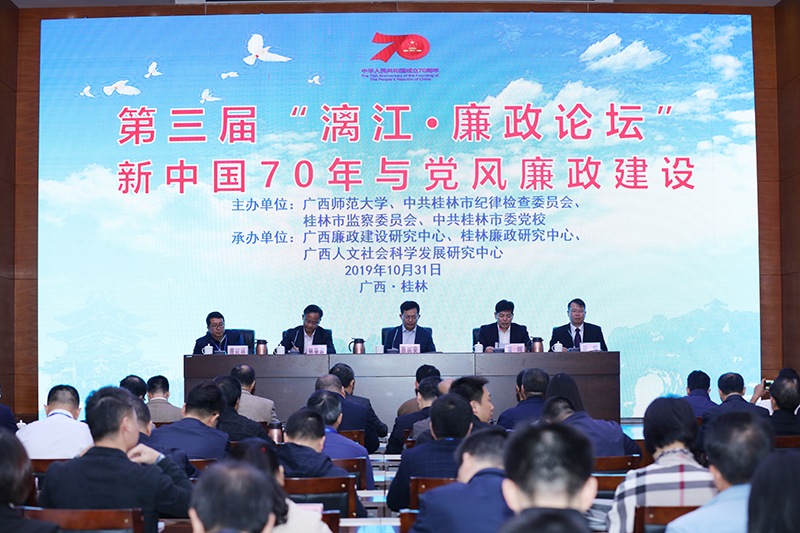 论坛围绕“新中国70年与党风廉政建设”主题,设立了主题报告、分论坛研讨和总结等议程。来自上海交通大学、成都理工大学、内蒙古大学、广西师范大学、青岛大学、湖北工业大学、重庆工商大学、广西广播电视台、中共桂林市委党校、中共佛山市委党校、桂林市纪委监委等等高校廉政研究机构、党校、纪检监察部门、企事业单位的十多家机构的负责人和专家学者做了主题演讲或大会交流。与会专家发言紧扣时代脉搏,具有较强的战略性、前瞻性和现实针对性,论坛成果对进一步贯彻落实习近平总书记全面从严治党的新要求,主动适应新时代廉政建设新形势,推进全面从严治党和反腐败工作不断向纵深发展,具有重要参考价值。