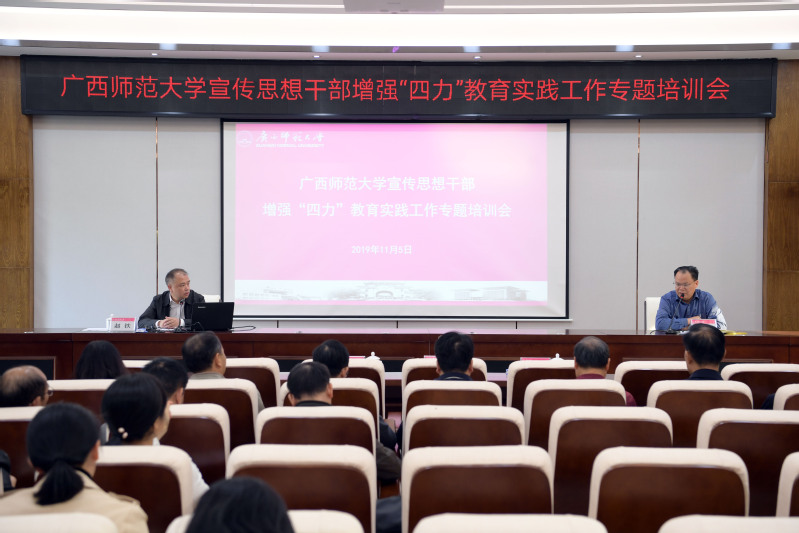 宣传工作是党的一项极端重要的工作。为了学习贯彻落实习近平总书记在全国宣传思想工作会议上的重要讲话精神,不断增强“四力”,提高履职本领,2019年11月5日上午,我校在雁山校区起文楼第五会议室召开宣传思想干部增强“四力”教育实践工作专题培训会。各二级单位党委、党总支书记和宣传委员,机关党委各支部宣传委员以及校党委宣传部全体干部参加了培训会。培训会由校党委常委、校长助理、宣传部部长黄轩庄主持。