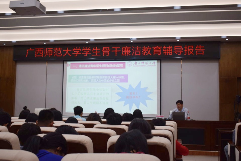为深入学习党的十九届四中全会精神,扎实开展理想信念和纪律教育,进一步推进青年学生廉洁教育和校园廉洁文化建设, 11月5日晚,校党委常委、纪委书记莫坷在雁山校区第五会议室为学生骨干作了题为《青年学生廉洁方面的问题检视及其防范》的廉洁教育辅导报告,漓江廉洁文化社社员、校青马班成员、校级学生组织主席团代表、校级学生社团负责人代表150余人参加了本次报告。