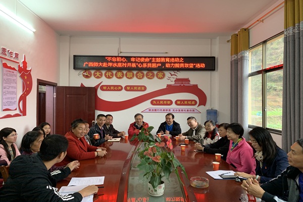 此行第一站首先来到坪水底村党群服务中心开展座谈,我校驻村扶贫工作队员戴福彪汇报了该村脱贫攻坚工作的推进情况以及今年扶贫工作的重点和村里产业发展的难点工作,接下来国教院、科技处、社科处主要负责人分别表示一定会尽全力支持坪水底村的脱贫工作。贫困户代表黄祥府在发言过程中表达了对广西师范大学帮扶单位的感谢,并表示一定会通过自己的努力实干实现脱贫,“我自己也会努力加油!”,黄祥府如是说,赢得了在场人员的热烈掌声。