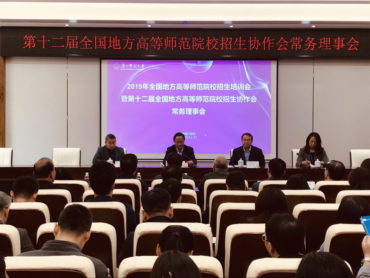 2019年全国地方高等师范院校招生培训会暨第十二届全国地方高等师范院校招生协作会常务理事会于11月20至22日在我校顺利召开,会议主题为“新高考改革背景下的招生对策”。这次会议共有全国28个省(直辖市、自治区)30所省属师范大学招生工作负责同志以及北京师范大学、华中师范大学、陕西师范大学、西南大学等部属院校同志共70余人参加会议,特别邀请了广西招生考试院罗索院长出席并讲话,同时邀请了桂林考试院领导和广西师范大学附属中学、南宁三中等区内13所中学校长参加本次会议。我校林春逸副校长和全国地方高等师范院校招生工作协作会常务理事会秘书长、北京市高等学校师资培训中心主任孙彤分别在开幕式上致辞。