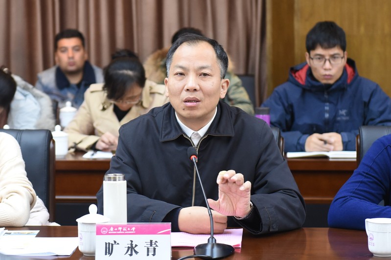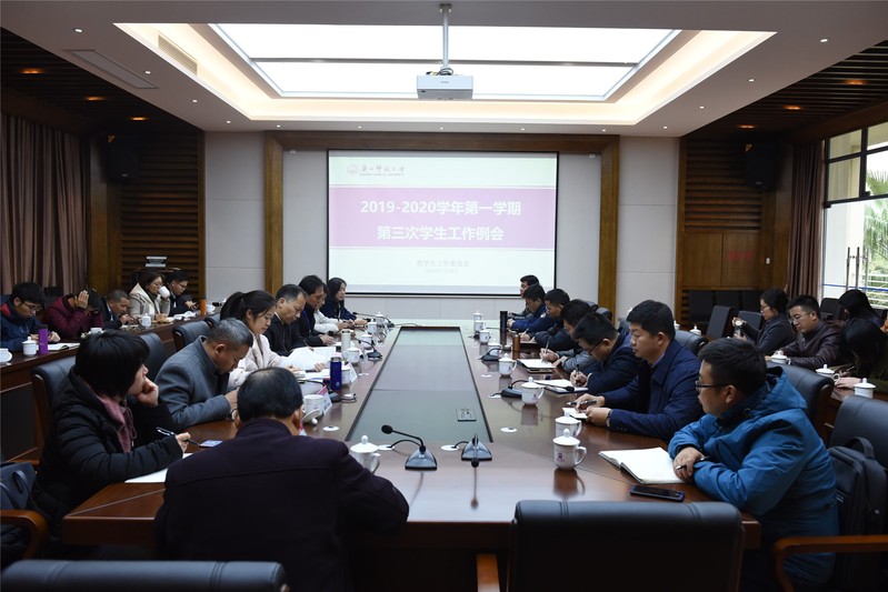 为深入学习贯彻党的十九届四中全会精神,总结学工系统“不忘初心、牢记使命”主题教育取得的成效,11月27日,我校在雁山校区起文楼第四会议室召开学工系统党的十九届四中全会精神学习会暨2019-2020学年第一学期第三次学生工作例会。校党委副书记旷永青出席,学工部(处)、校团委、保卫处、教务处、财务处、研究生院、后勤保障处/后勤集团相关负责人,各学院(部)分管学生工作的党委副书记以及学工部(处)、校团委各科室相关人员参加会议。会议由学工部(处)主要负责人主持。
