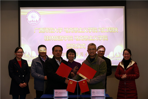 为加快推进桂林旅游学院马克思主义学院发展,助力广西思想政治理论课程教育质量整体提升,12月4日下午,我校马克思主义学院与桂林旅游学院马克思主义学院对口帮扶签约仪式暨学科建设研讨座谈会在桂林旅游学院举行,桂林旅游学院党委书记林娜和我校马克思主义学院党政领导出席了会议。