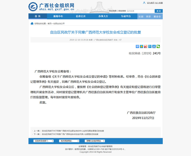 广西壮族自治区民政厅下发了关于同意成立“关于广西师范大学校友会成立登记的申请”的批复