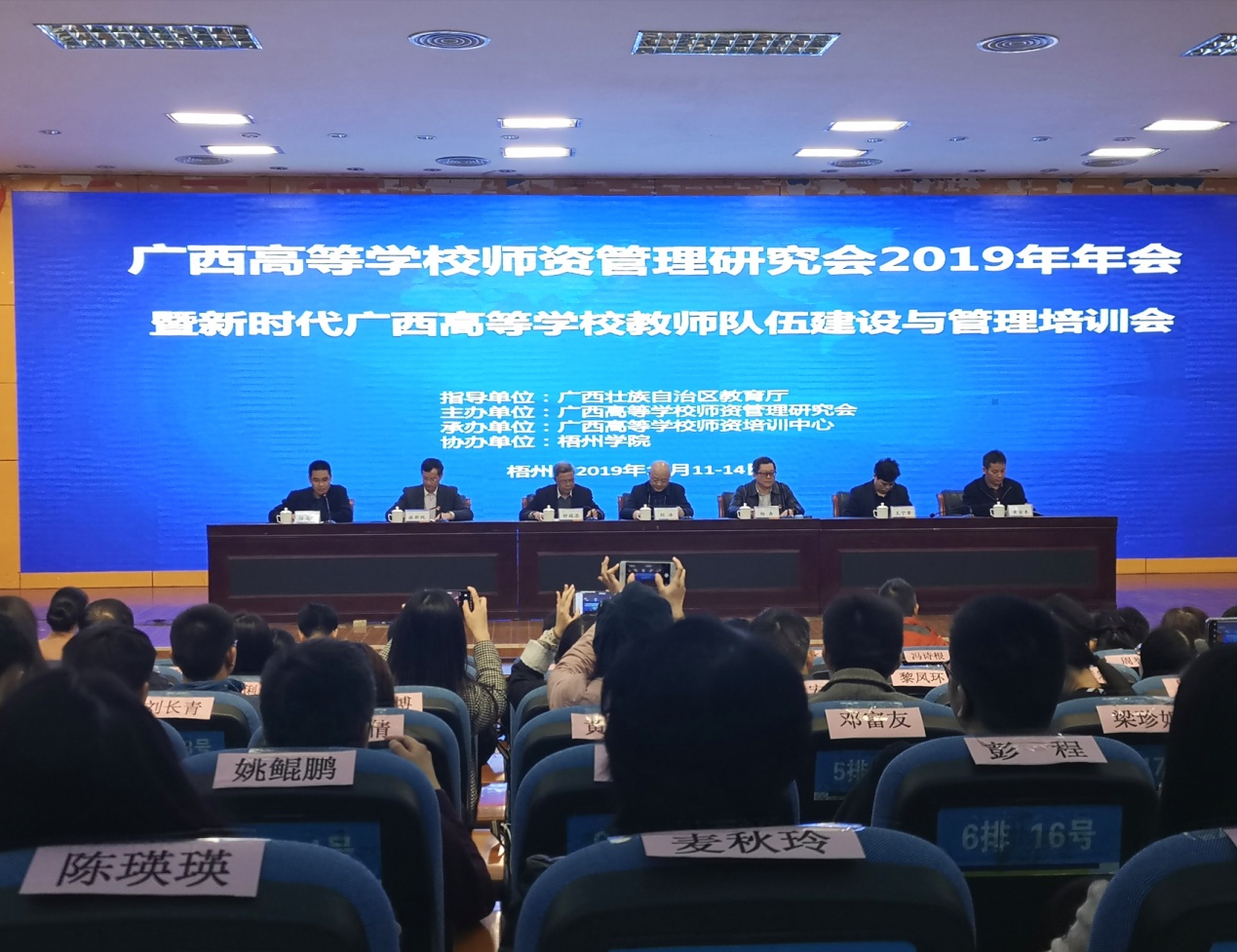12月11日至14日,广西高等学校师资管理研究会2019年年会暨新时代广西高等学校教师队伍建设与管理培训会在梧州顺利召开。本次会议由自治区教育厅指导,由广西高等学校师资管理研究会主办,广西高等学校师资培训中心承办,梧州学院协办。自治区教育厅教师工作处处长刘冰,梧州学院校长杨奔、副校长麻新纯,广西师范大学原副校长、广西高等学校师资管理研究会第八届常务理事会会长钟瑞添,和来自区内近60所高校的110多人参加了会议。杨奔校长、钟瑞添会长在开幕式上分别致辞。
