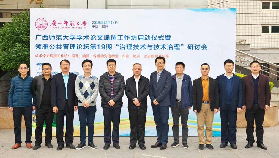 紧接着,广西师范大学学术论文编撰工作坊的各位参会专家,按照党的十九届四中全会所提出的“推进国家治理体系和治理能力现代化”的宏大战略,紧密围绕“治理技术与技术治理”这一主题,结合各自的研究专长,展开了深入的探讨。主题发言具体包括,上海交通大学韩志明教授提交的“技术治理的变与常”,中国人民大学马亮教授提交的“数字政府建设:公务员准备好了吗”,南开大学吴晓林教授提交的“技术赋能与科层规制——技术治理中的政治逻辑”,华中师范大学袁方成教授提交的“技术治理的风险及其逻辑——以精准扶贫为研究对象”,暨南大学颜昌武教授提交的“技术治理在公共行政中的兴起与嬗变”,浙江工商大学张丙宣副教授提交的“数字驱动的乡村治理”。各位专家不仅学养深厚、思维敏锐,而且语言幽默诙谐,与现场师生互动密切,现场反响十分热烈。本期编撰工作坊的研讨成果,经过严格的三审三较之后,将整体地刊发于《广西师范大学学报》(哲学社会科学版)2020年第2期。