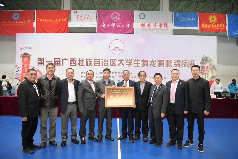 12月17日—19日,第一届广西壮族自治区大学生舞龙舞狮锦标赛在我校举行,本次比赛由广西学校体育卫生艺术学会主办,广西师范大学、广西学校体育卫生艺术学会龙狮分会承办。本次锦标赛邀请了国际龙狮运动联合会第一副主席、马来西亚龙狮运动协会主席梁溧棠,中国大学生体育协会舞龙舞狮分会常务副主席、秘书长黄益苏教授,国际关圣宫同盟总会盟主陈忠兴,国际关圣宫同盟总会总会长陈嘉辉,国际关圣宫同盟总会秘书长廖势德,国际关圣宫同盟总会顾问林浩,香港发强体育会主席谭定邦,香港关圣宫同盟会会长梁宝胜,中国关圣宫同盟会会长陈贺平等嘉宾出席,来自广西区内的15所高校,269名运动员参加了本次比赛。