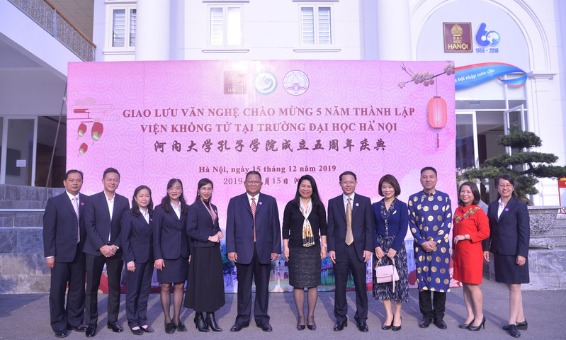 12月15日,访问团在越南河内参加河内大学孔子学院成立5周年庆典活动。河内大学党委书记、校长阮文朝教授带领该校国际交流处、教务处、中文系、孔子学院等负责人与我校访问团成员进行了交流。我校邓军书记介绍了我校基本情况,并感谢越南河内大学对孔子学院办学的大力支持。河内大学党委书记兼校长阮文朝教授也表示,河内大学对孔子学院办学给予极大的支持,希望能与广西师范大学有更多的合作项目,以推动两校共同发展。会谈结束后,在孔子学院第五届理事会上,孔子学院院长杜青云女士对孔子学院的工作进行了总结,河内大学孔子学院中方副院长罗军对2020年的工作计划进行了介绍,河内大学党委副书记、副校长阮氏菊芳女士及相关人员、我校访问团成员参加了会议。邓军书记对孔子学院出色的工作表示赞赏,孔子学院搭起了中越文化交流的平台,希望老师们克服困难,做好文化中越交流工作。晚上8时,在河内大学音乐厅举行了孔子学院成立5周年庆典活动,我校邓军书记为对孔子学院做出突出贡献的教师、领导颁发荣誉证书。中国人民网、新华网等新闻媒体现场直播。