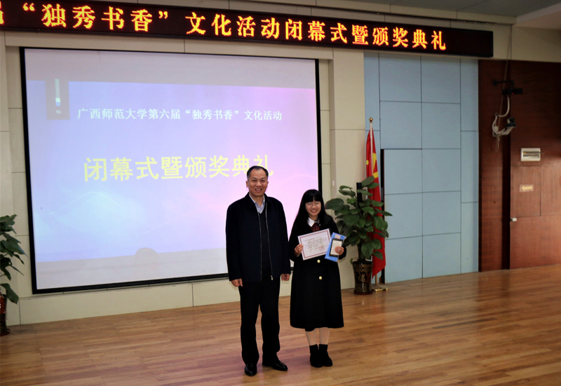 12月25日下午,我校第六届“独秀书香”文化活动闭幕式暨颁奖典礼在雁山校区大学生学术报告厅举行。校党委副书记旷永青出席活动,宣传部、学生工作部(处)、校团委、校教育发展基金会、图书馆等部门负责人,图书馆管理协会会员、获奖人员以及部分师生代表参加了此次活动。