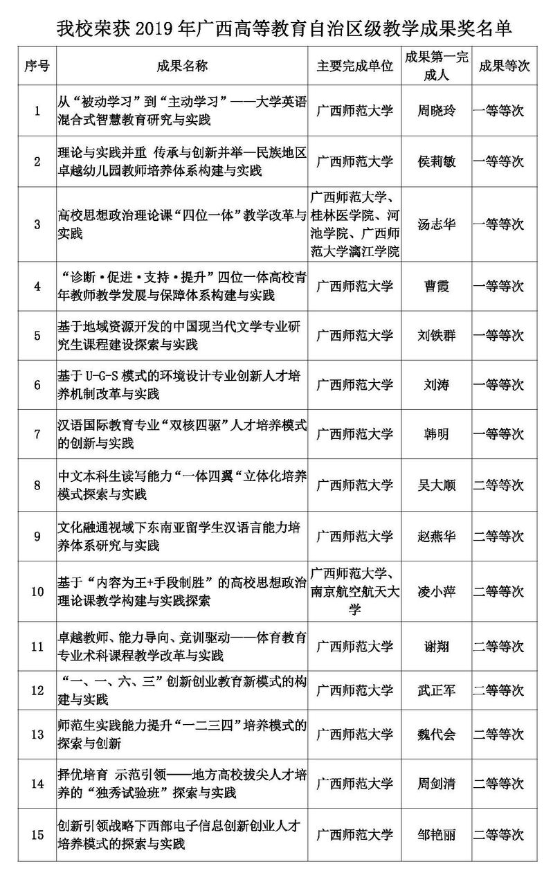 近日,自治区教育厅印发《自治区教育厅关于公布2019年广西高等教育自治区级教学成果等次评定结果的通知》,我校推荐的“从‘被动学习’到‘主动学习’——大学英语混合式智慧教育研究与实践”等7项教学成果荣获一等奖,“中文本科生读写能力‘一体四翼’立体化培养模式探索与实践”等8项教学成果荣获二等奖。