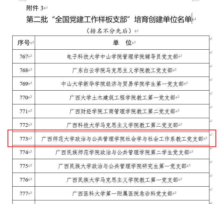 1月8日,教育部办公厅公布第二批全国党建工作示范高校、标杆院系、样板支部培育创建单位名单,共有10个高校党委、100个院系党组织、1000个党支部分别入选。广西有1个院系党组织、32个党支部榜上有名。我校政治与公共管理学院社会学与社会工作系教工党支部脱颖而出,入选全国“党建工作样板支部”培育创建单位。这是政治与公共管理学院党委多年来坚持不懈抓党建、提升基层组织力、久久为功的结果,也是社会学与社会工作系教工党支部全体党员同志不忘初心、牢记使命,凝心聚力抓党建、一心一意促发展,深入贯彻落实党的十九大精神,围绕中心工作开展各项活动,加强党的基层组织建设,积极发挥基层党组织的战斗堡垒作用和党员的先锋模范作用的成果体现。