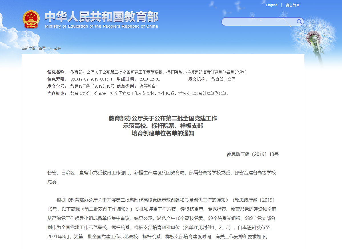 据悉,第二批新时代高校党建示范创建和质量创优工作(简称新时代高校党建“双创”工作)2019年7月底启动,是深入贯彻落实习近平新时代中国特色社会主义思想和党的十九大精神,深刻学习领会全国教育大会、全国高校思想政治工作会议、学校思想政治理论课教师座谈会精神的重要推动力量,是加快一流大学和一流学科建设、实现高等教育内涵式发展、办好人民满意教育的坚强组织保证。培育创建的建设周期为两年(2020年1月至2021年12月),按照新时代党的建设总要求,通过培育创建,以点带面发挥引领带动作用,推动全国高校各级党组织全面进步全面过硬,推动全国高校党建质量全面创优全面提升。
