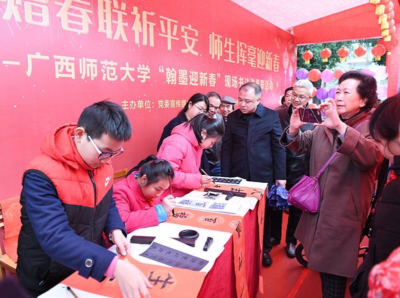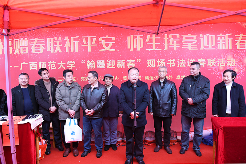 这次活动特别邀请了我校老中青少不同年龄层次的书法家和书法爱好者共同为广大师生书写春联,送出祝福。参与春联书写的书法家及书法爱好者有:中国书法家协会会员、广西书法家协会理事、我校美术学院书法系主任唐长兴,卓然小学书法教师曾云、黄云飞,离退休教师代表陈照斌、陈玉秋、杨启秋、梁志华以及美术学院研究生、卓然小学小学生代表。