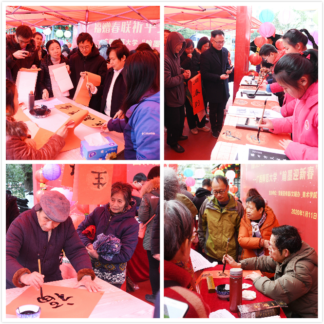 为弘扬“迎新春、送祝福”这一中华民族传统文化,营造喜庆、文明、和谐的春节文化氛围,丰富全校师生文化生活,我校宣传部/文明办、美术学院、离退休工作处、卓然小学联合举办2020年“翰墨迎新春”现场书法送春联活动。校党委副书记赵铁,校党委宣传部、美术学院、离退休工作处、卓然小学负责人莅临现场指导。校党委宣传部副部长、文明办副主任主持活动。