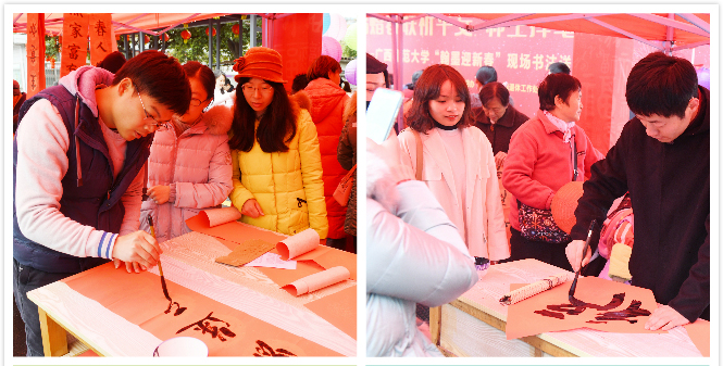 1月11日上午,育才校区南门呈现一派热闹景象,火红的舞台搭起来,喜庆的音乐奏起来,书法家和书法爱好者们纷纷挥墨送“福”送春联。