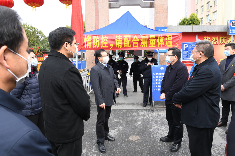 2月9日上午,桂林市委常委、政法委书记赵志军,副市长、市公安局局长朱永辉,副市长兰燕一行来我校检查指导疫情防控工作。我校党委书记邓军,校党委副书记、校长贺祖斌,校纪委书记莫坷,副校长林春逸陪同检查。