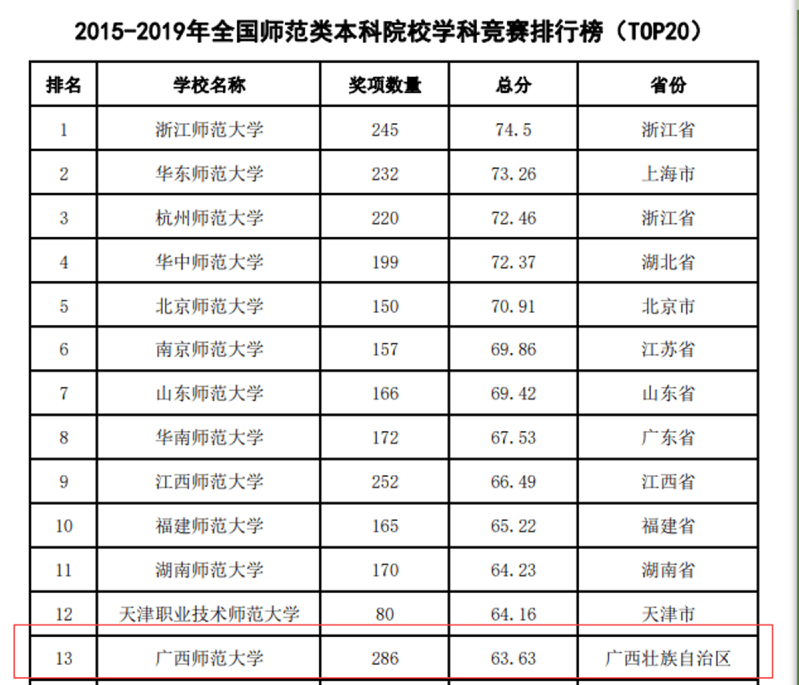 我校在2015-2019年全国师范类本科院校学科竞赛排行榜(TOP20)位列13